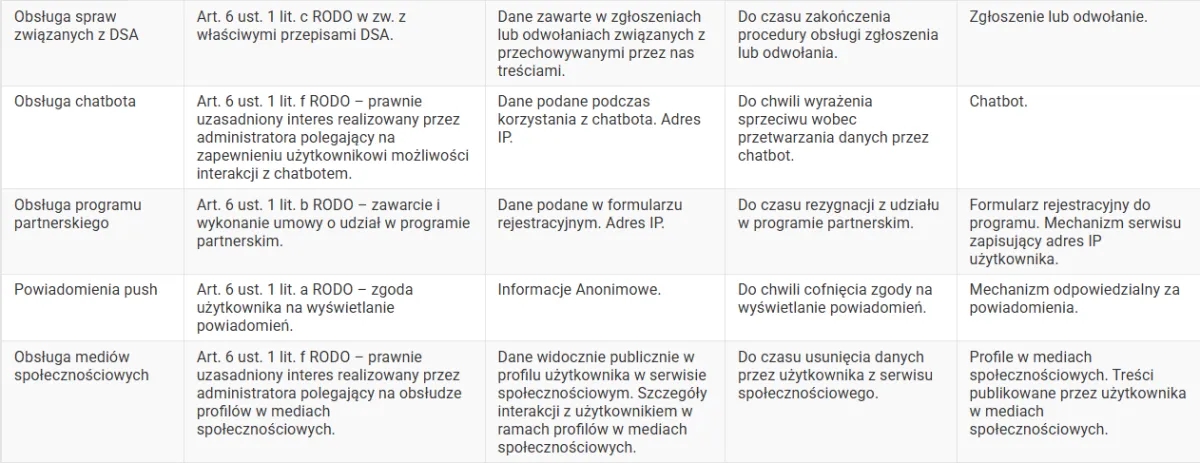 Twoje dane osobowe przechowujemy tak długo, jak to jest uzasadnione w ramach danego celu przetwarzania danych osobowych, w związku z czym okresy przetwarzania różnią się w zależności od celu - ich określenie znajdziesz w tabeli stanowiącej załącznik do polityki prywatności.